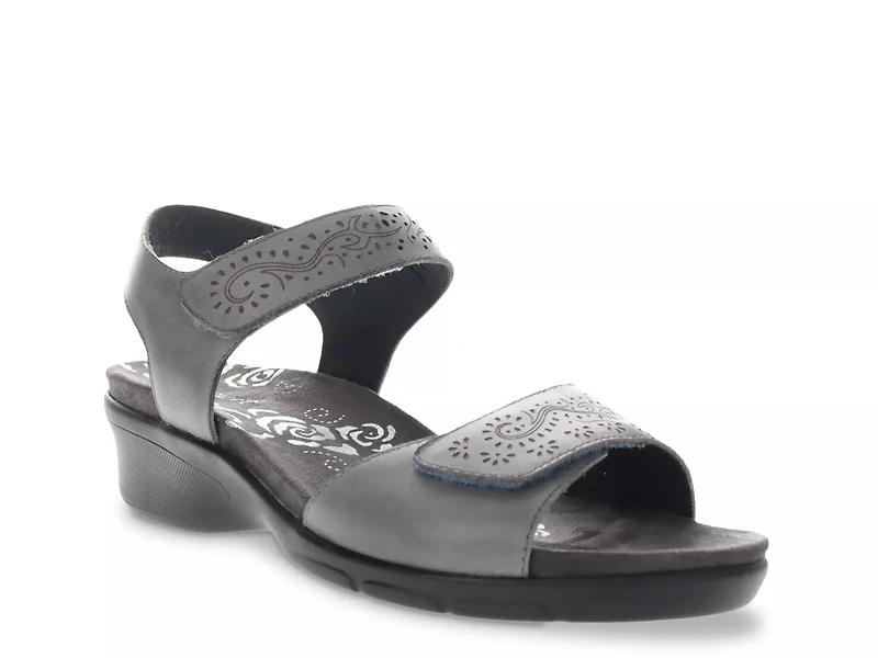 The Propet Wanda sandal offers you both style and comfort. Detailed with attractive laser cuts on its adjustable straps, this ankle strap sandal is sure to turn heads. Designed with a shock-absorbing faux leather sole that reduces foot fatigue and rubber inserts maximizing traction, there's no stopping you.