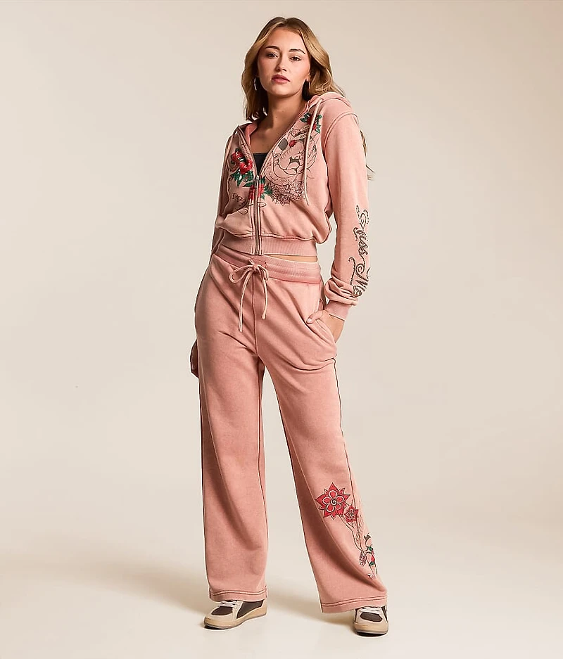 Rhinestone graphic French terry lined sweatpant Inseam measures 32" Elasticized cinch tie waistband Side seam pockets