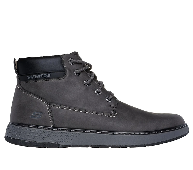 Classic style and comfort arrives in Skechers Waterproof Relaxed Fit®: Garlan - Pryor. Featuring a waterproof lace-up faux leather upper with a charcoal-infused Air-Cooled Memory Foam® insole and Skechers Goga Mat Arch™ cushioning for added support.