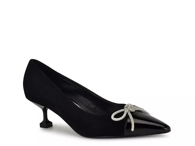 Sophisticated and sparkling, the Wendon pump from Nine West will complement any formal look. This pair features a sensible kitten heel and is elevated by a glossy cap toe and rhinestone-covered bow accent.