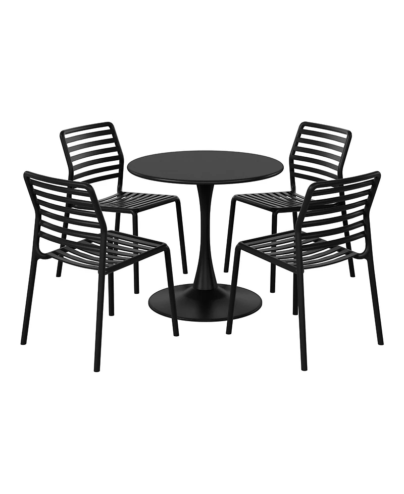 Elevate your outdoor gatherings with this four-person dining set. The round metal bistro table features a rust-resistant e-coating and a wide flat base for enhanced stability. Four stackable, lightweight chairs made from Uv-resistant polypropylene resin offer easy rearranging and space-saving convenience. Their palm-leaf backrest adds charm, while the ventilated, contoured design improves airflow and comfort. The chairs arrive fully assembled, and the table sets up quickly, making this 5-piece set the perfect patio upgrade for the season.