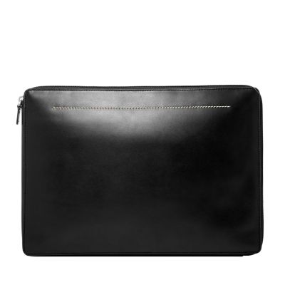 This leather laptop sleeve features fossil nickel roller hardware. Fossil leather products support responsible manufacturing via the Leather Working Group.
