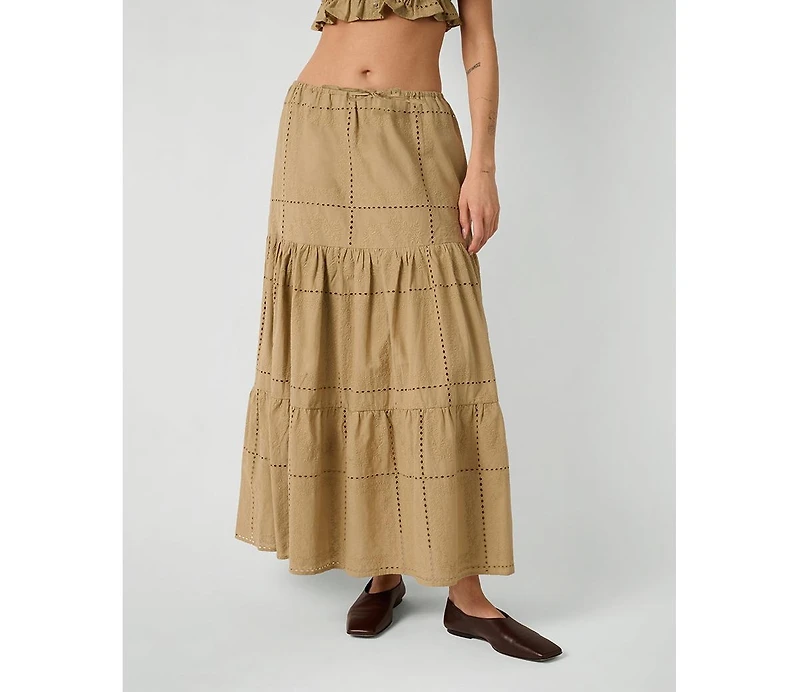 This midi skirt is made from tiers of cotton patchwork eyelet. It s fully lined and has an encased elastic waistband with drawcords for a pull-on fit.