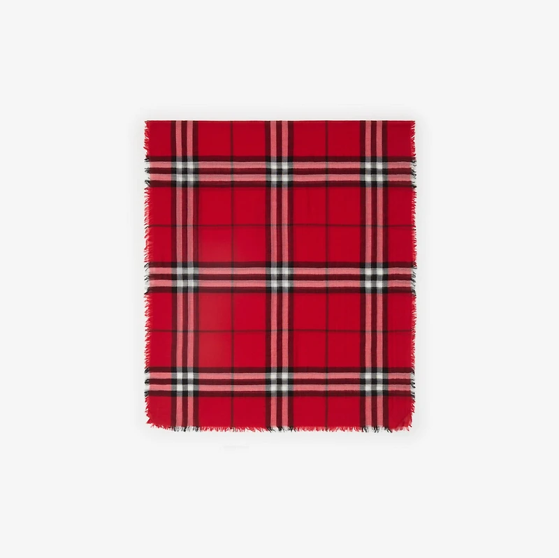 A lightweight wool scarf made in Italy. The design is woven with the Burberry Check. Rectangular Eyelash fringing at the edges