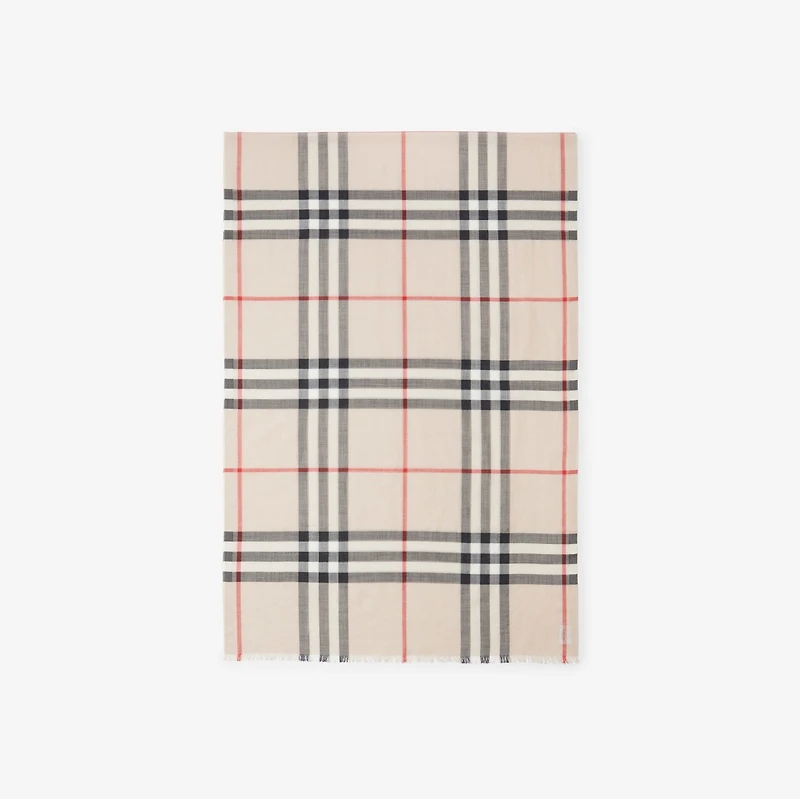 An Italian-made wool silk scarf in a lightweight gauze weave printed with the Burberry Check. Rectangular Eyelash fringing at the edges