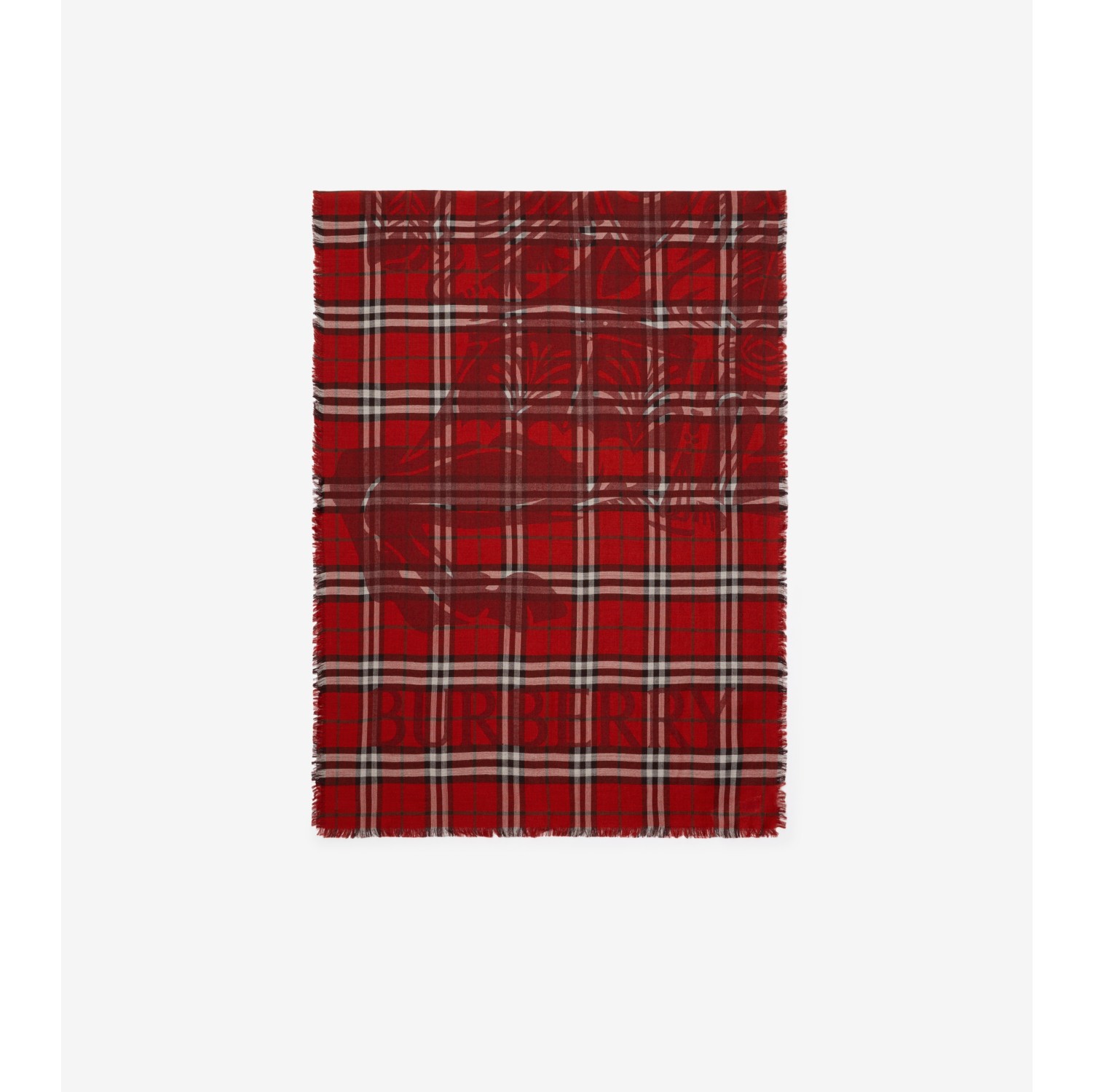 A wide scarf made in Italy from lightweight wool silk, designed for year-round wear. The style is jacquard-woven with our Equestrian Knight Design, logo and the Burberry Check in a seasonal post red colourway. Rectangular Eyelash fringing at the edges