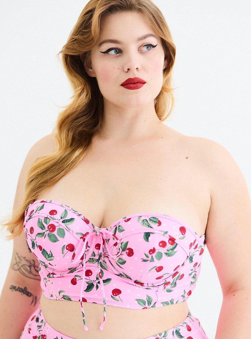 FIT Underwire. Longline. Bustier silhouette. MATERIALS + CARE Nylon-blend knit fabric. 80% nylon, 20% spandex. Machine wash cold. Line dry. Imported. DETAILS Adjustable straps. Swan closure at back. Nonfunctional front tie.