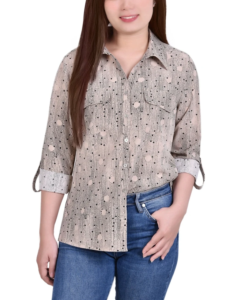 Lots of details make this Ny Collection blouse a must have this season with it's bias cut placket and chest pockets.