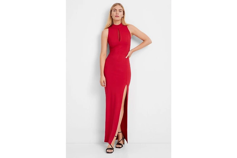 The Gabriette Dress from Marcella is eveningwear that brings the drama, without compromising elegance. A long, sleeveless gown in structured, mid-stretch ponte, she features a mock neckline with a mesh cutout detail, and a thigh-high slit that leaves you unrestricted to dance the night away.