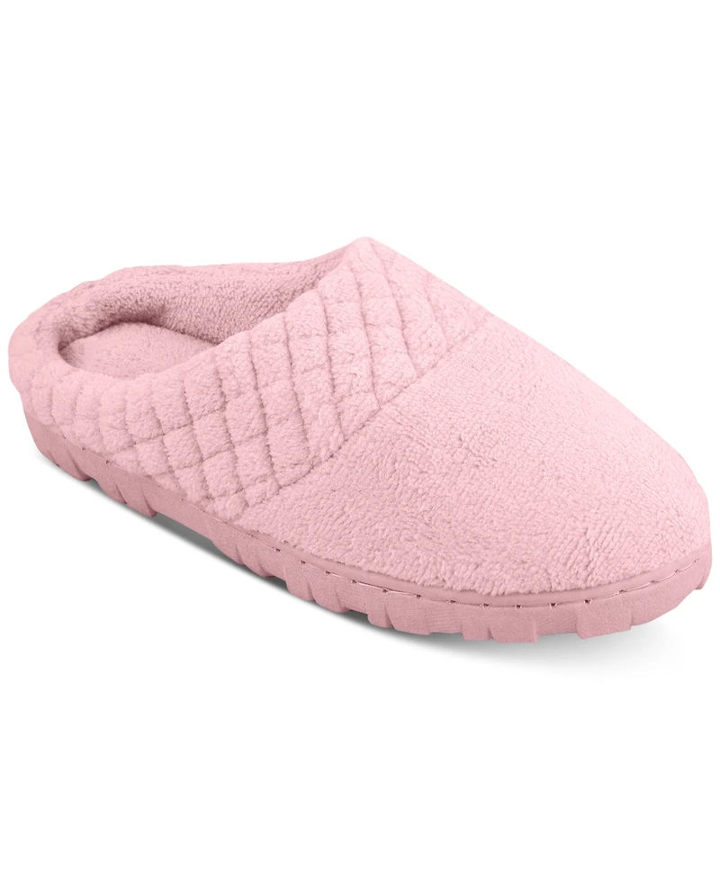 For years, Muk Luks trusted mainstay has been our Clog Slippers. Our customers keep coming back to these dependable styles for their soft fabrics, comfy insoles, washable convenience and classic designs. Muk Luks Quilted Clog Slipper with quilted band is 100% polyester with memory foam insole. This style has a Tpr sole which can be worn inside and outside! Available in sizes S (5-6), M (7-8), L (9-10), and Xl (11-12) in colors Blue Lavender and Pink. Imported. Wipe with damp cloth. Do not bleach. Dry flat