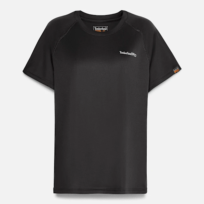 This women's short-sleeved T-shirt has our Timberland PRO® WickWork™ technology with antimicrobial treatment for odor control. It features raglan sleeves for an improved range of motion and an overlock at the sleeves to protect against friction.