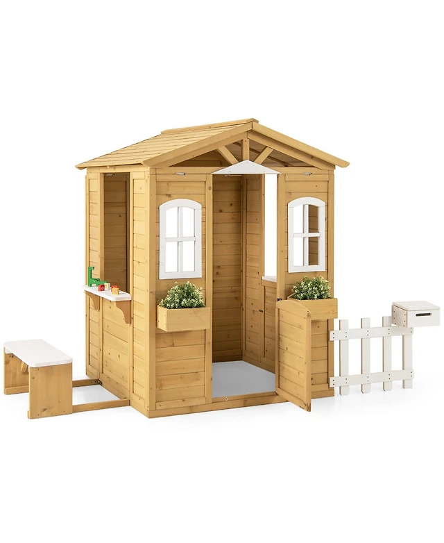 Wood Playhouse with Bench and Serving Stations for 2+ Years Old Kids