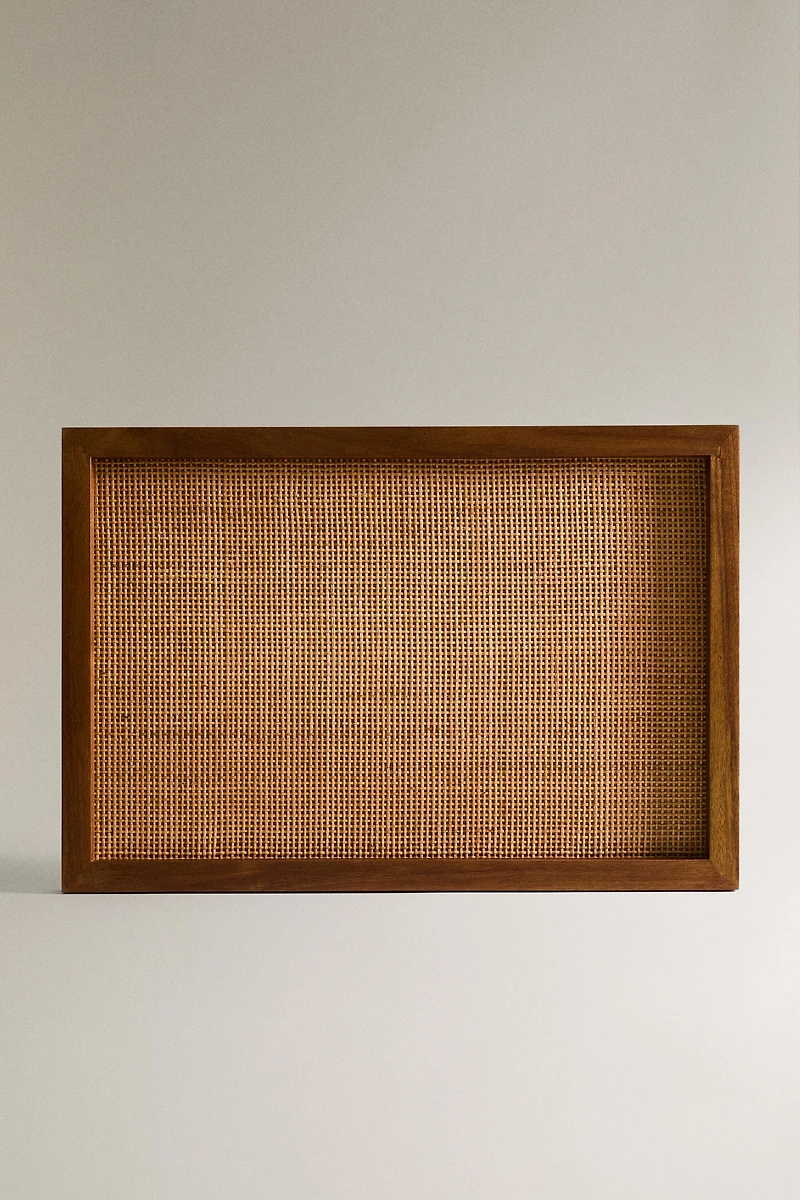 Rectangular wooden tray with a rattan base. It has two handles, one on each end.