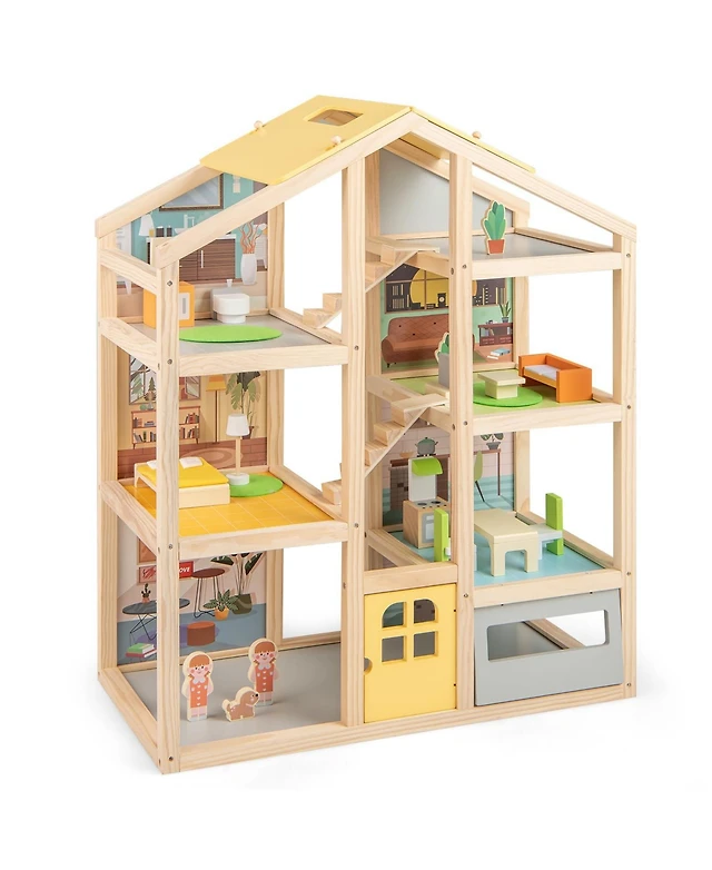 Sugift Kids Wooden Dollhouse 3 Level with Double-Sided Roofs and Doors