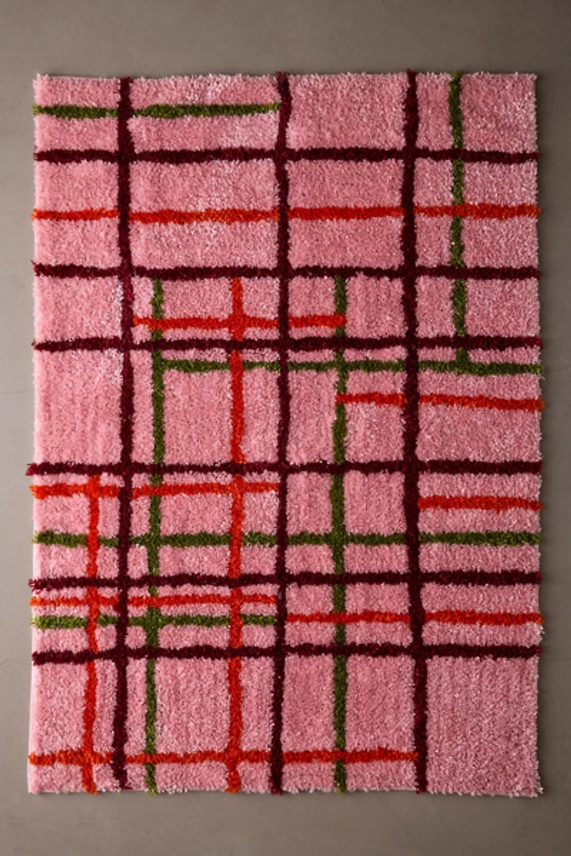 Add color to your space with this plush, shaggy-tufted area rug. This boucherite-inspired area rug features a crosshatch design in vibrant shades. Available exclusively at Urban Outfitters.