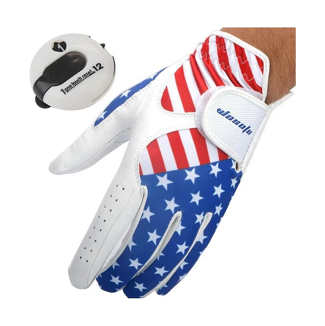 Wosofe Golf Gloves Men's Left Hand Cabretta Leather with Score Counter Usa Flag White Soft Breathable Professional Mini