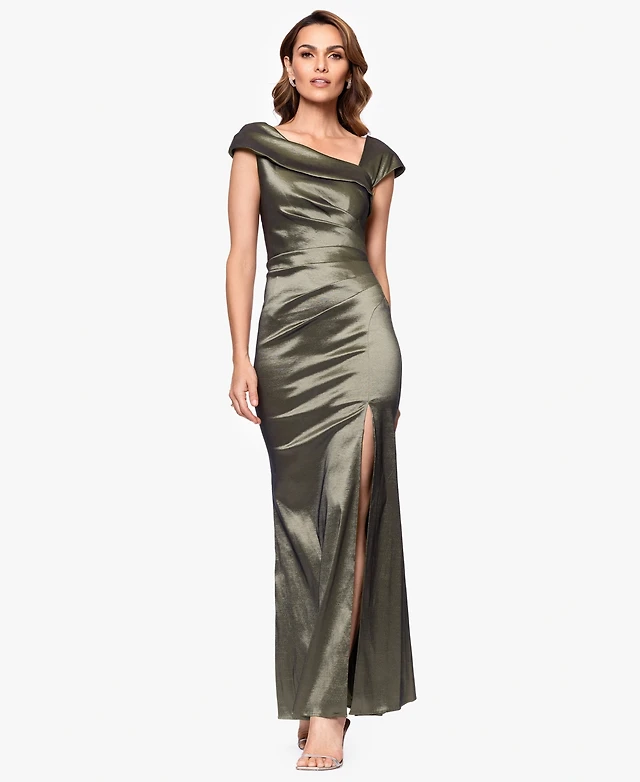 Xscape Petite Asymmetrical-Neckline Long Sheath Dress