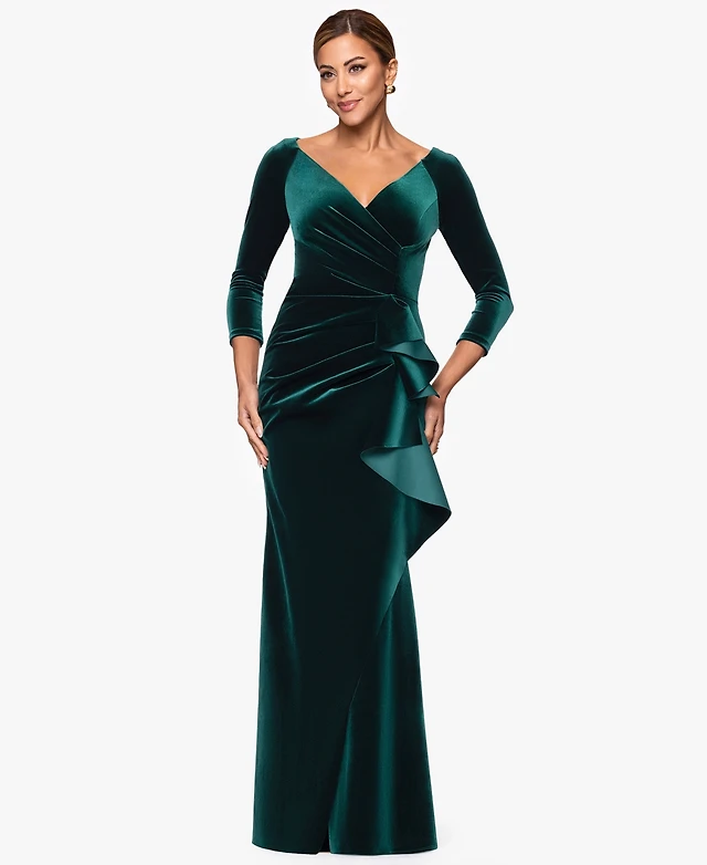 Xscape Women's Velvet V-Neck Ruffle-Front Long-Sleeve Gown