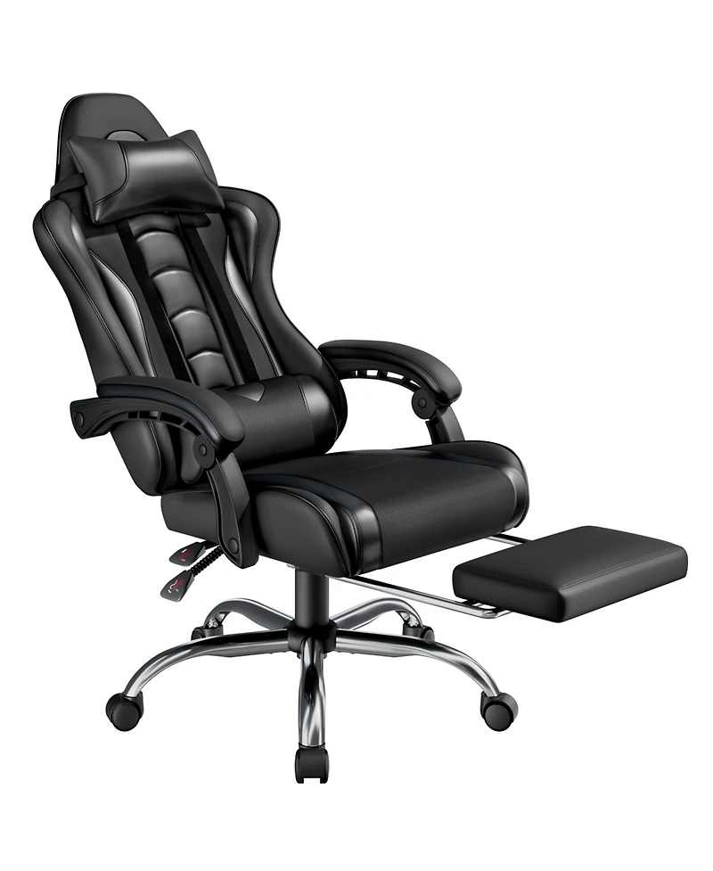 Elevate your gaming setup with this ergonomic racing chair, complete with a footrest for ultimate comfort. Customize your seating with adjustable height, 135-degree recline, and extendable footrest. Features include a removable head pillow, massage lumbar support, and padded armrests. Perfect for game rooms, home offices, and more.