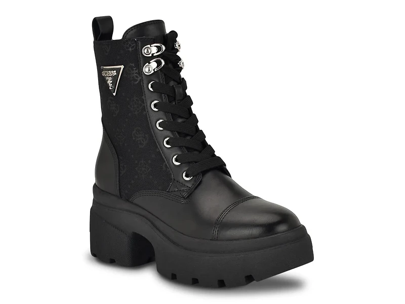 Bring out your bold side in the Yarini bootie from Guess. Featuring a combat-inspired silhouette, chunky platform and heel, and lugged sole, this pair balances rugged flair and sleek appeal.