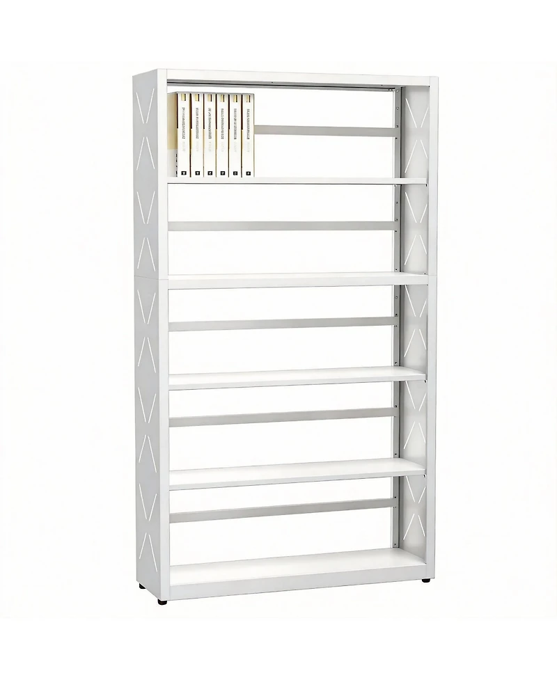 Metal 5-tier bookcase, cold-rolled steel with powder coat, rust-proof and wipe-clean. Anti-tip kit and adjustable feet keep it steady. Three-side panels stop items falling and hide clutter. Four shelves move up or down to fit books or decor center shelf stays fixed for strength. Clean white finish suits living room, kitchen, office or bedroom, uses little floor space. All parts labeled, simple instructions and video guide assembly. Weight: 0.04 pounds. Length: 10.00 inch. Width: 16.00 inch. Height: 55.00 inch.