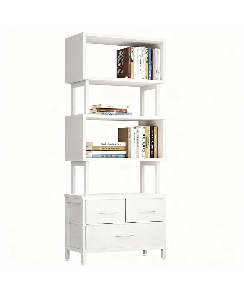 Geometric Display Shelf – Modern staggered-rectangle unit fits any room five open tiers show books, plants, decor, two medium plus one large drawer hide clutter steel frame with shelf guards, anti-tip kit and leveling feet keep it steady labeled parts and tools for fast setup. Weight: 0.03 pounds. Length: 9.40 inch. Width: 23.62 inch. Height: 61.50 inch.