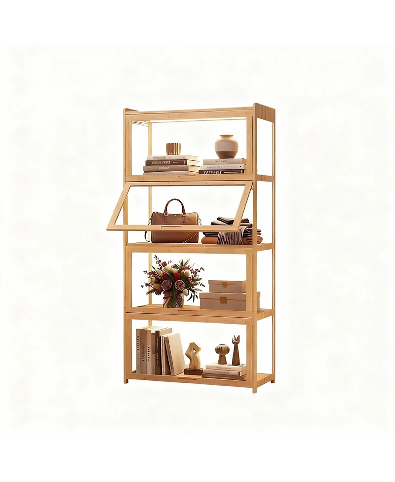 Bamboo and acrylic display cabinet with four shelves. Strong bamboo frame holds 33 lb per shelf. Flip-top door opens with a light push and stays open magnetic close keeps dust out. Clear panels give full view of collectibles, books, or crafts. Slim design fits living room, office, playroom, or study. Weight: 0.03 pounds. Length: 13.50 inch. Width: 27.50 inch. Height: 55.00 inch.