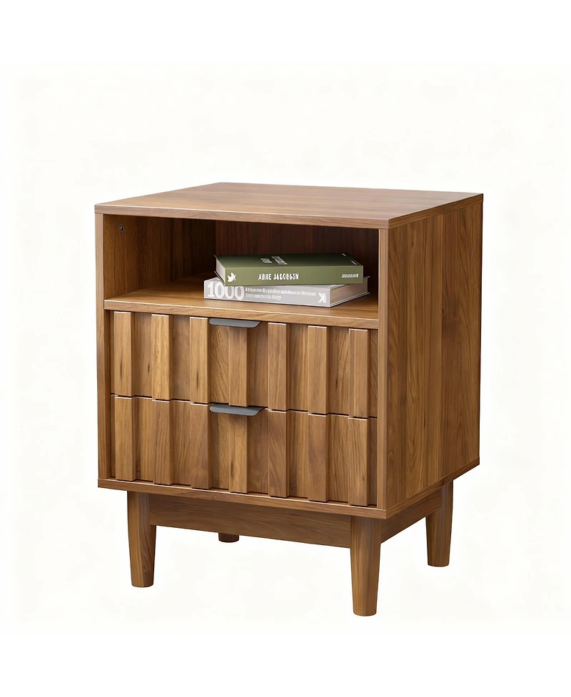 Yigii Fluted Pattern Modern Nightstand with 2 Drawers & Open Shelf