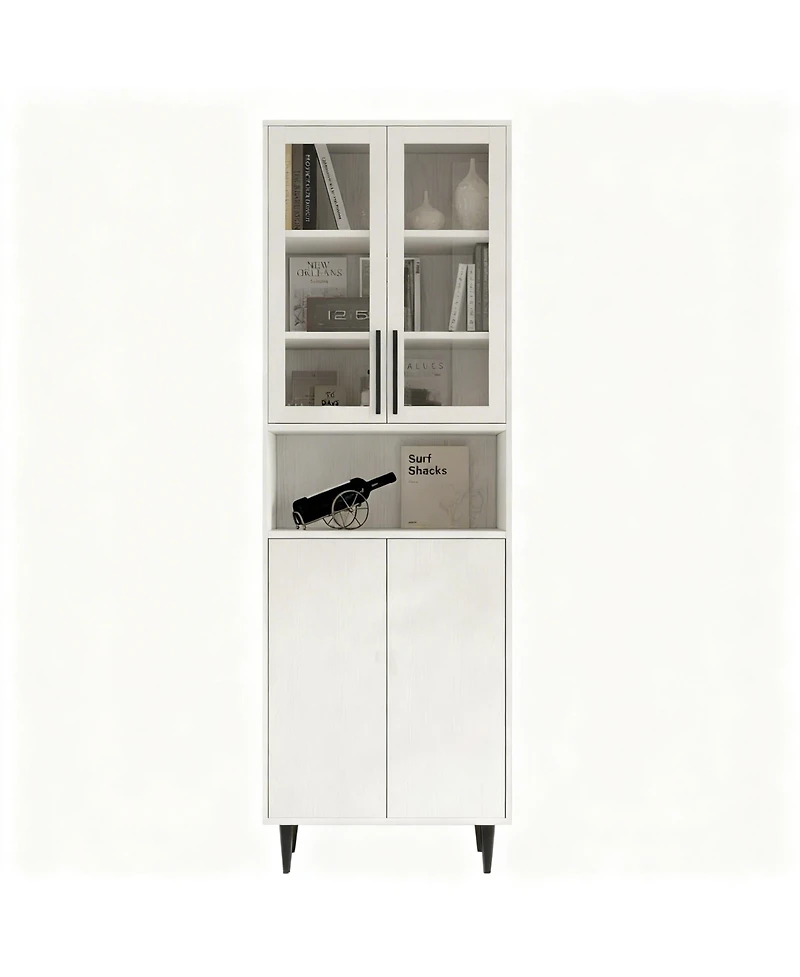 Smart Dimensions: Standing tall with a compact width, this cabinet offers generous storage with fixed shelves. The elevated base is robot-vacuum friendly, making cleaning a breeze. Premium Dual-Access: Features elegant tempered glass doors to showcase items beautifully, plus smooth push-to-open wooden doors that offer concealed storage with a modern touch. Both options provide secure, dust-free protection for your belongings. Built to Last: This sturdy cabinet features shelves with strong weight capacity, perfect for heavy books and decor. The elevated base not only adds modern flair but lets your robot vacuum glide underneath for truly hassle-free cleaning. Easy Assembly and Support: Includes pre-drilled holes, numbered parts, and clear instructions for hassle-free assembly.Weight: 0.15 pounds. Length: 15.70 inch. Width: 23.60 inch. Height: 70.90 inch.