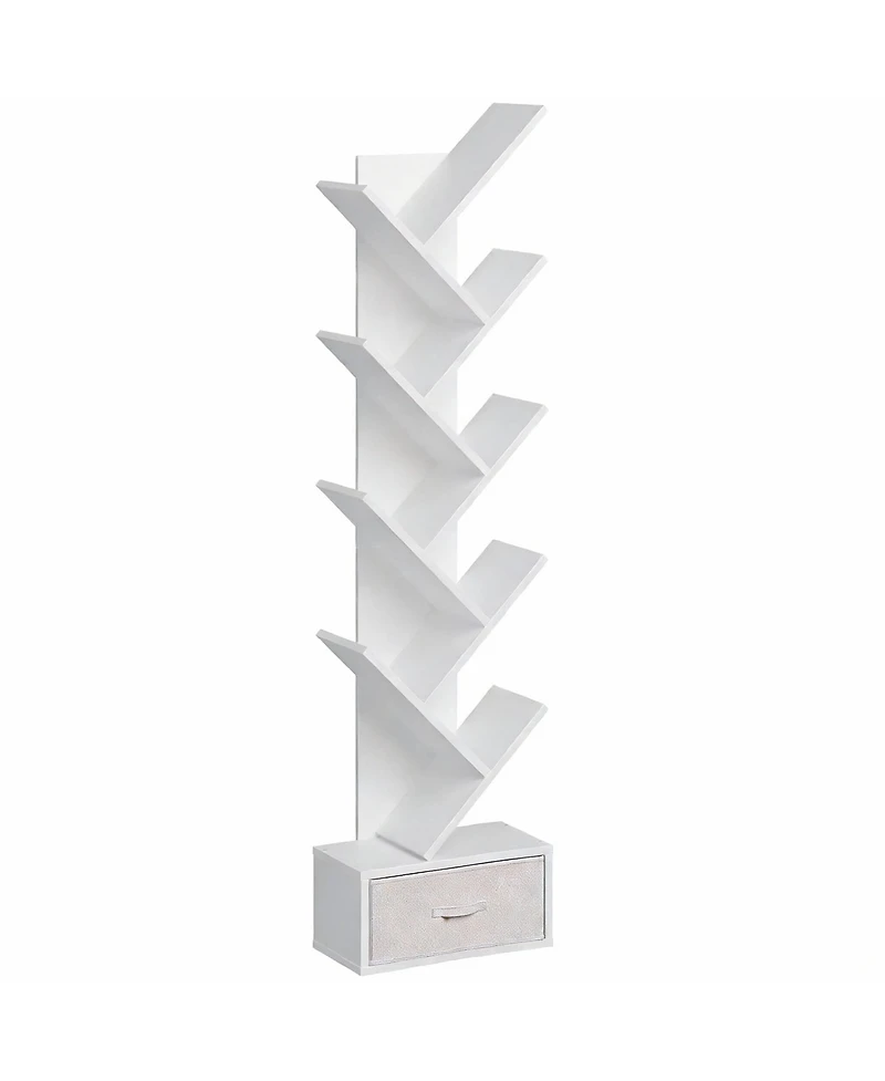 Tree-shaped shelf brings rustic charm to any corner. Nine tiers and one drawer hold 5-10 books each, saving space while keeping novels, magazines and decor in view. Solid engineered wood meets Epa safety rules drawer is fabric-lined. All parts, tools and clear instructions assemble in about fifteen minutes wipe clean with damp cloth. Use in living room, office, study or store. Weight: 0.05 pounds. Length: 8.15 inch. Width: 14.96 inch. Height: 58.70 inch.