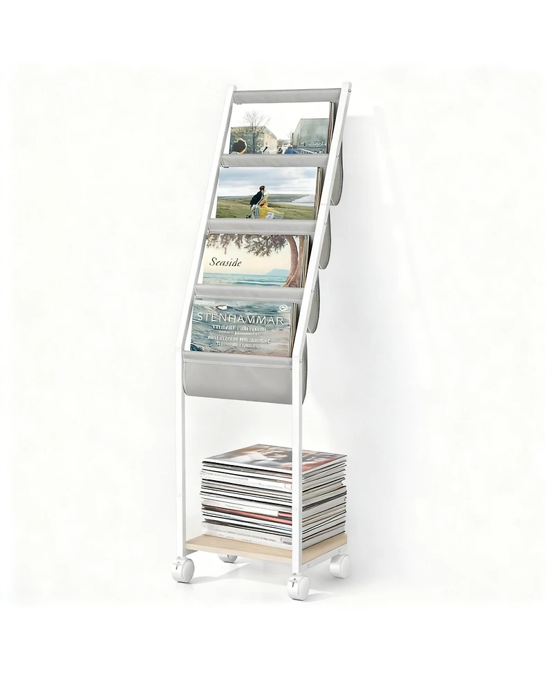 The 4 slot design offers sufficient space to store and display your vinyls visible yet tidily, allowing easy browsing and selection.Large Capacity and Multifunctional Storage. Features 4-tier fabric slot with wooden stand to store records in organized manner. Holds up to 70-100 LPs, and can also hold decorations or other items. Works for magazines, books, CDs and newspapers. Premium Materials and Movable Casters.The soft fabric holds records sturdily and protects from damage. With rotating wheels with brakes, easily move around your space. Retro Classic Design. With black frames and brown board, retains vintage feel without compromising modern style, creating quaint atmosphere. Adaptable to different decorating styles. Easy to Assemble and Thoughtful Service. Comes with numbered parts and instructions. Takes 15-20 minutes to assemble.Weight: 12.35 pounds. Length: 11.80 inch. Width: 15.35 inch. Height: 59.05 inch.