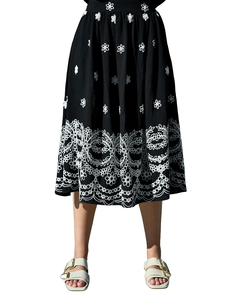 This elegant skirt features intricate white embroidered detailing that creates a beautiful, eye-catching contrast. Designed with a mid-calf length and a softly gathered silhouette, it offers graceful movement and a refined, feminine look. The embroidery along the hem adds a standout finish, making it perfect for both daytime charm and evening sophistication.