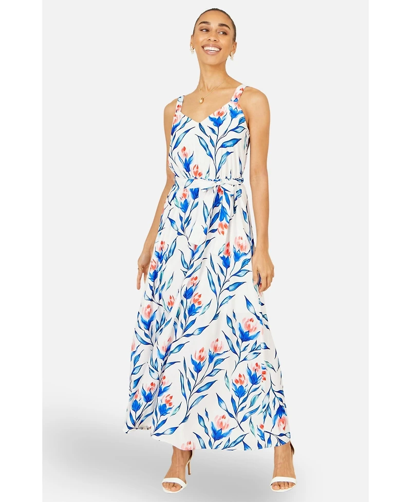 This effortlessly elegant maxi dress is a standout choice for warm, sunny days. Designed with a flattering V-neckline and wide shoulder straps, it flows beautifully into a full-length skirt that moves gracefully with every step. The bold floral print brings a fresh, summery feel, while the self-tie waist cinches the silhouette for a feminine, comfortable fit. Perfect for holidays, garden parties or relaxed summer evenings, this dress offers timeless style with ease.