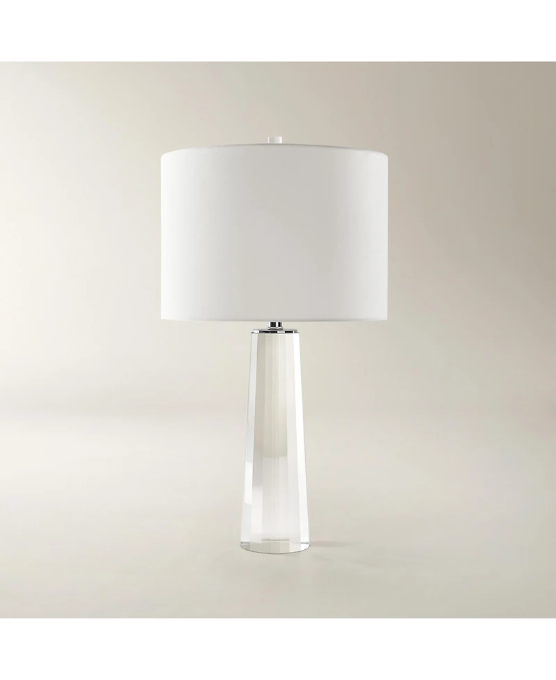 Classic and refined, this table lamp is crafted of clear crystal with 16 facets that beautifully reflect the light. A white drum shade secured with a clear ball finial and polished nickel accents complete the look.