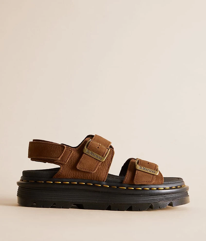 Leather strappy sandal Adjustable buckle straps Hook and latch ankle strap AirWair arched cushion footbed 2 1/8" platform heel
