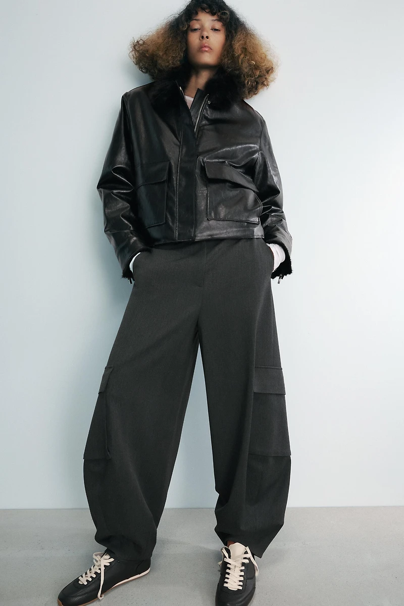 Jacket with main faux leather fabric. Lapel collar with faux fur trim and long sleeves. Front flap patch pockets. Front zip closure with concealed button placket.