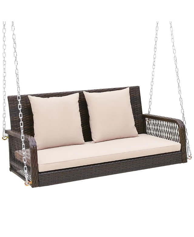 2 Person Wicker Hanging Swing Bench, Front Porch Swing Outdoor Chair with Cushions 550 lbs. Weight Capacity for Backyard, Garden, Cream White