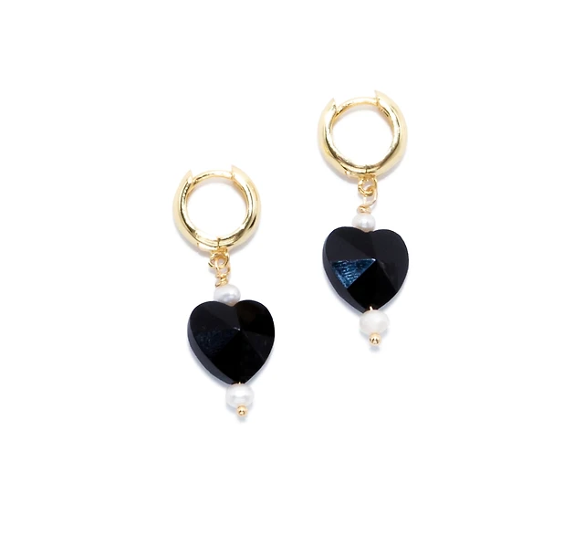 18K Gold Plated Huggies Freshwater Pearls with Black Heart Charm - Kuro Earrings For Women
