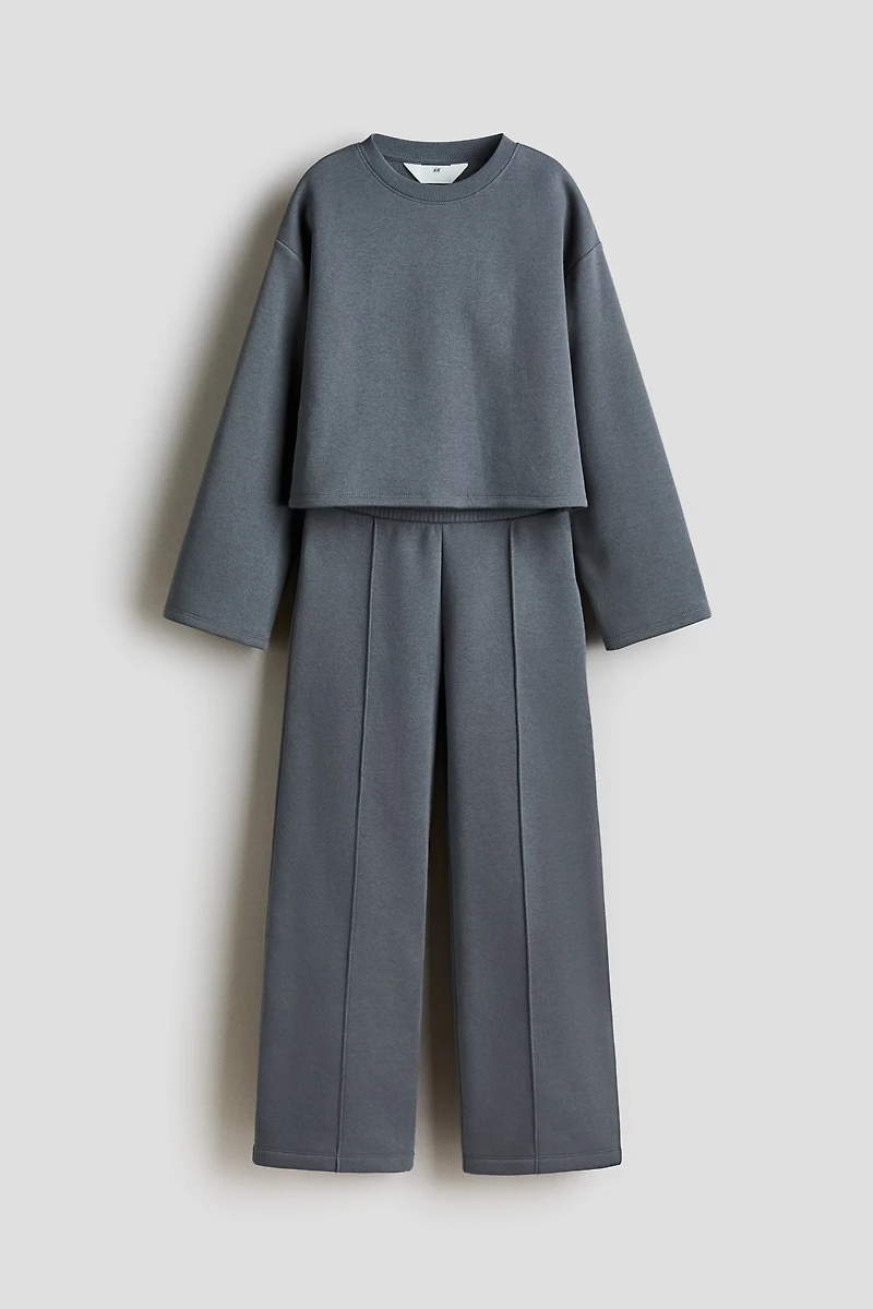 Set with a top and a matching pair of joggers in sweatshirt fabric with a soft brushed inside. Long-sleeved top with a round, rib-trimmed neckline and dropped shoulders. Joggers with an elasticated waist and straight legs with sewn-in creases down the front.