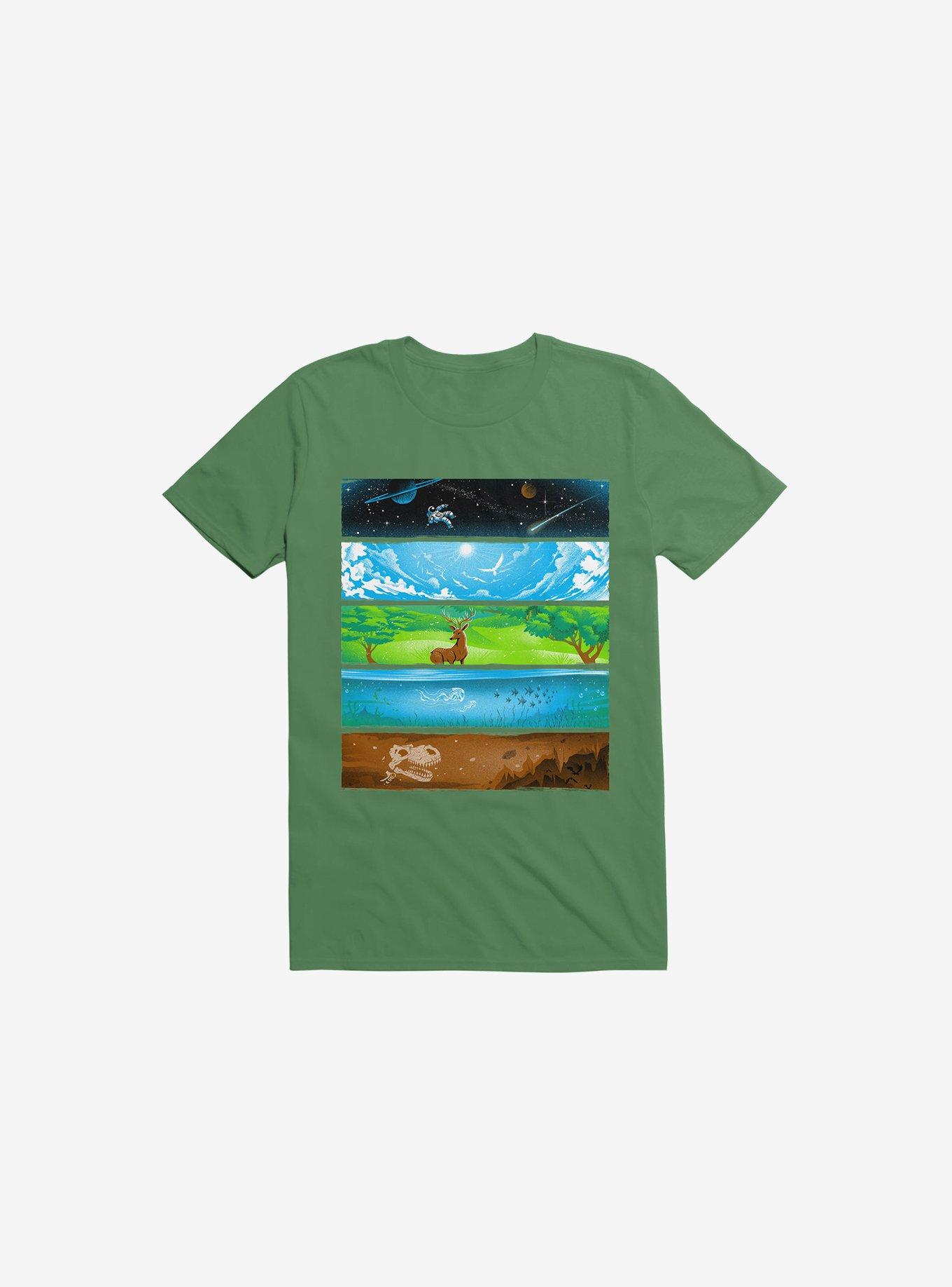 Celebrate our beautiful planet with this lightweight kelly green graphic tee. Panel 1 features an astronaut in space, Panel 2 features a bird soaring in sunlit skies, Panel 3 features a deer in the woods, Panel 4 features jellyfish in the sea, and Panel 5 features dinosaur fossils underground. Officially licensed art from Tobe Fonseca.