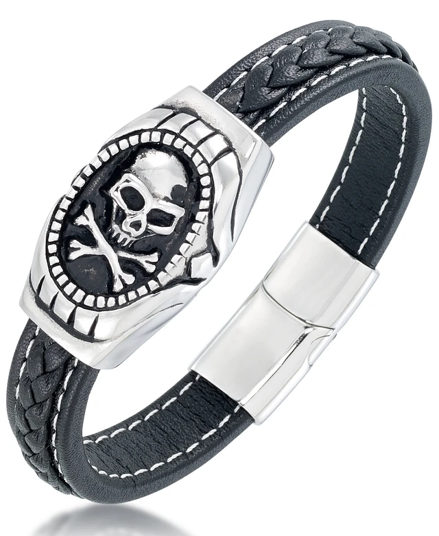 Steeltime Men's Black Braided Leather and Stainless-Steel Skulls Bracelet