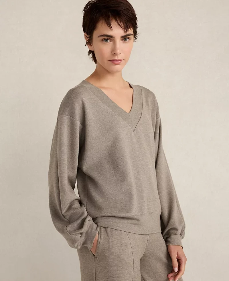 Haven Well Within. A thoughtful collection of lounge, sleep home and lifestyle essentials your trusted resource for all things wellbeing. Made from a drapey, scuba - like fabric, this long sleeve top offers a luxuriously smooth feel and effortless movement. The flattering V - neck make it a versatile piece for layering or wearing on its own., Hit: Hits slightly above hip, Imported:, Length: 22 3/4"long, Fabrication: 85% Lenzing Ecovero Viscose, 9% Polyester, 6% Spandex, Garment Care: Machine Washable Haven Well Within Soft Knit V - Neck Top by Ann Taylor Size Classic - XS Forest Brown Heather Women's Crew, Neck Half Zip Sweaters 85% Lenzing Ecovero Viscose 9% Polyester 6% Spandex Machine Washable