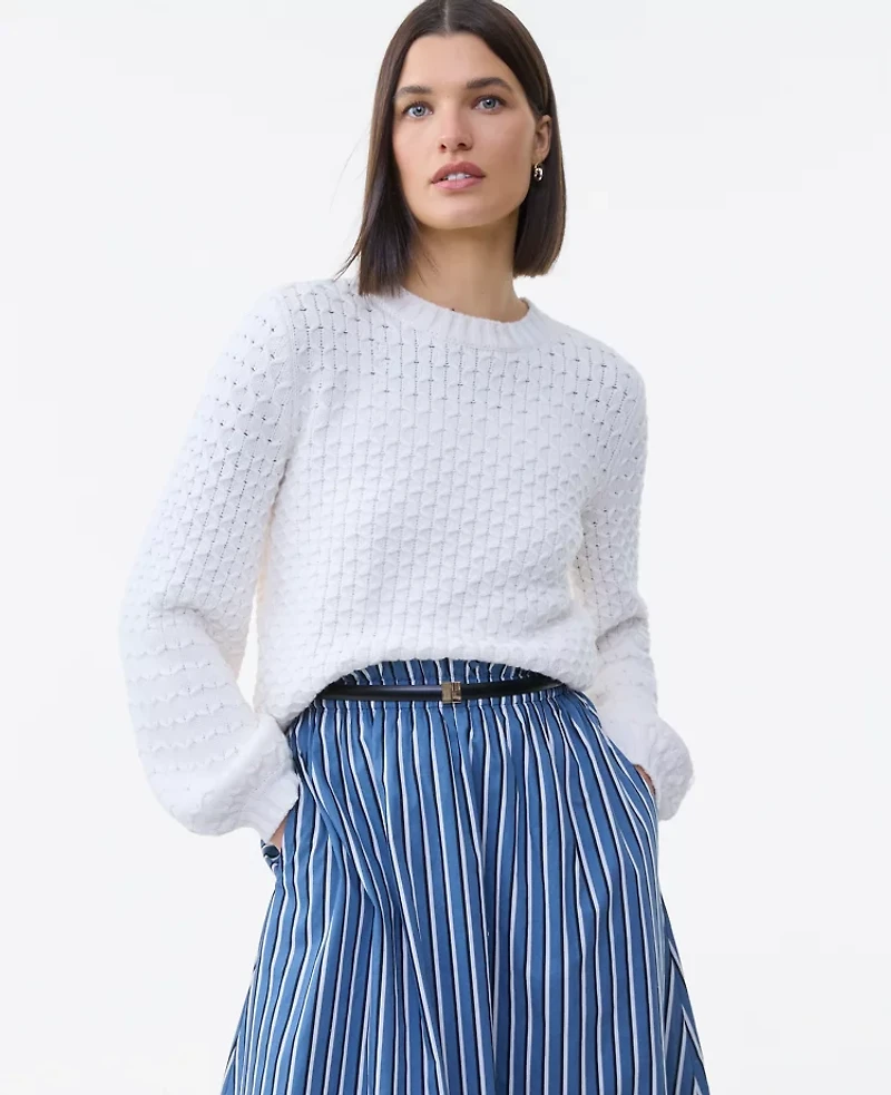Designed in a light and airy honeycomb stitch, this soft and cozy crew neck sweater deserves a spot in your wardrobe. Ribbed crew neck, cuffs and hem. Drop shoulders, Imported:, Fit: Softly fitted, Length: 21 1/2"long, Fabrication: 53% Cotton, 27% Polyester, 20% Nylon, Garment Care: 53% Cotton, 27% Polyester, 20% Nylon Petite Honeycomb Cable Crew Neck Sweater by Ann Taylor Size Petite - 2XS Winter White Women's Cotton, Blend Crew Neck Long Sleeve Pullover Sweaters 53% Cotton 27% Polyester 20% Nylon 53% Cotton 27% Polyester 20% Nylon Best Fall Sweaters