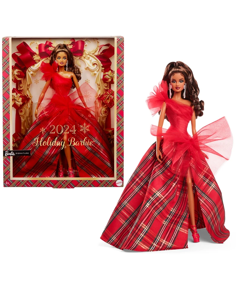 The 2024 Holiday Barbie doll embodies the warmth and love of the season with a festive gown and party look Showcasing gorgeous drama, the dress pairs a draping, one-shoulder, sparkling red bodice with a full, plaid ballgown-style skirt. Big tulle accents are a modern take on a classic look. In packaging that's ideal for display, this collectible doll makes a great gift for 6-year-olds and up. Includes doll stand and Certificate of Authenticity. Doll cannot stand alone. Colors and decorations may vary.