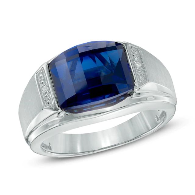 Men's Barrel-Cut Blue Lab-Created Sapphire & Diamond Accent Ring 10K White Gold