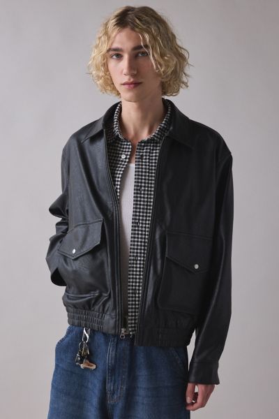 Update your everyday with this faux leather jacket by the essential BDG label. Go-to bomber jacket silhouette with a collar, snap closure pockets and a zippered front. Add edgy and laidback vibes to any outfit with this premium faux leather jacket. Urban Outfitters exclusive.