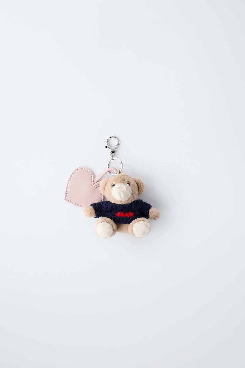 Keychain with a washer and a carabiner-type clasp. Plush bear and heart pendant.