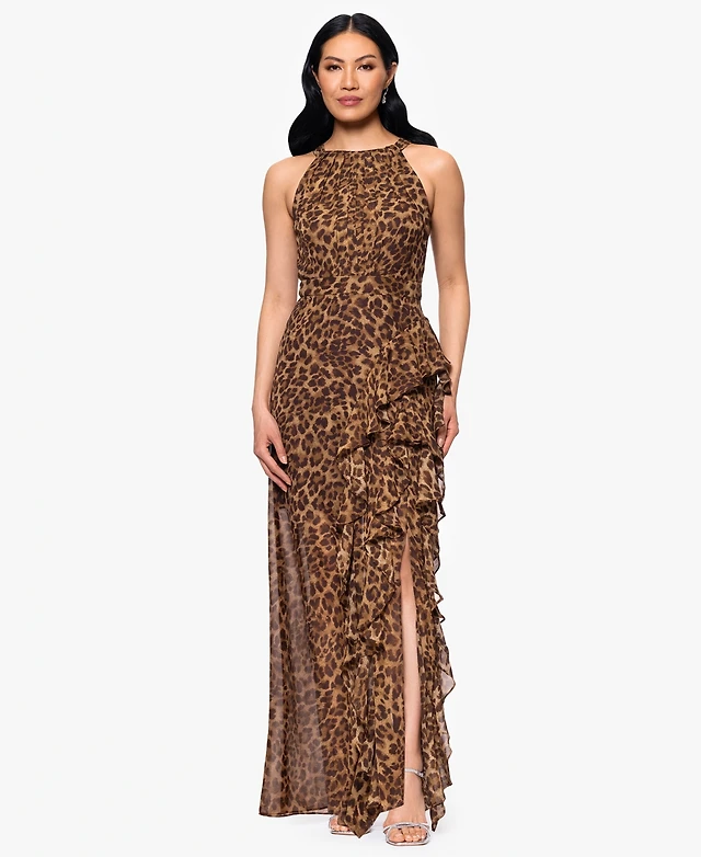 Betsy & Adam Petite Printed Ruffled Halter Gown