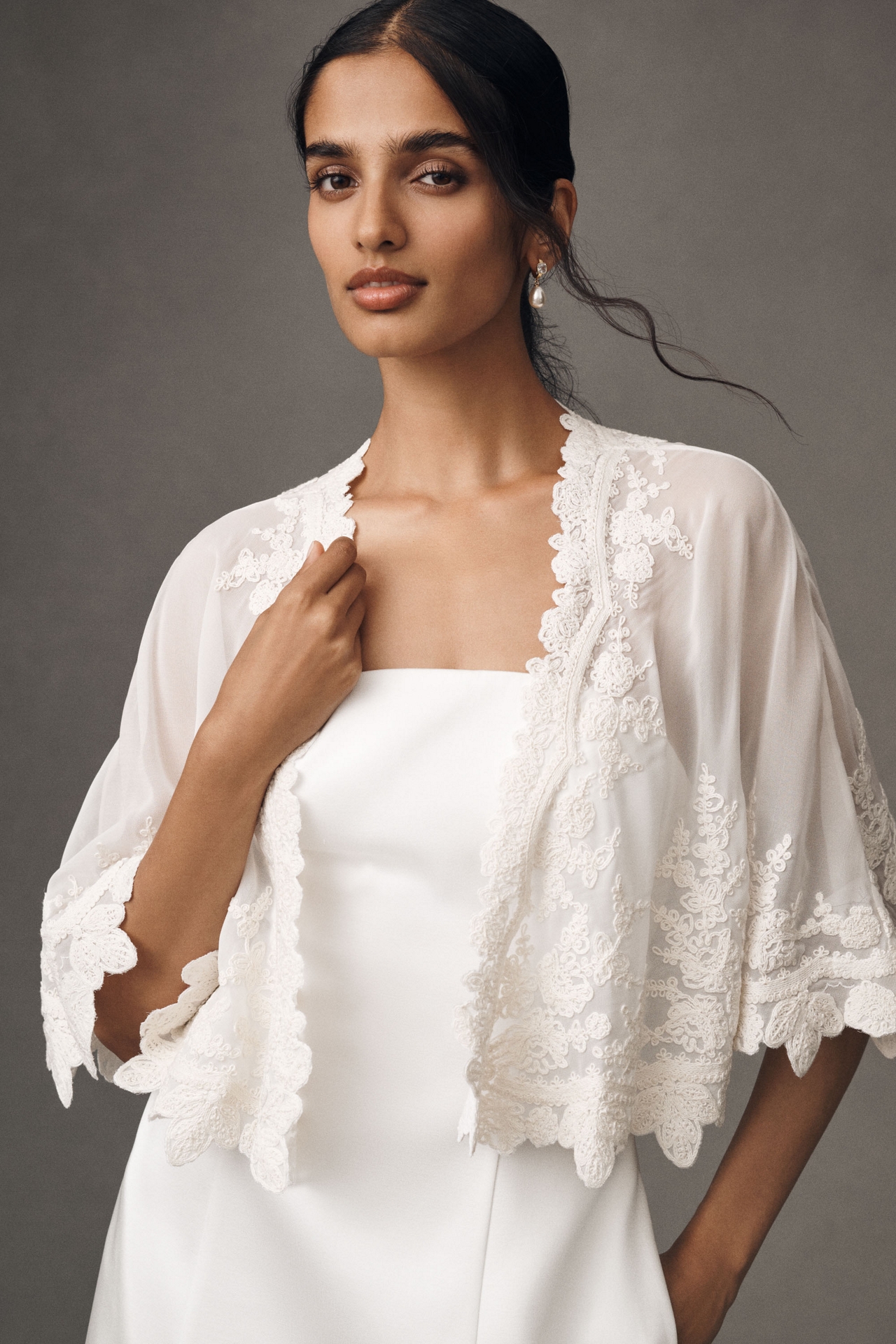The BHLDN Embroidered Lace Bolero features delicate floral lace and intricate embroidery, offering a romantic layer perfect for adding elegance to bridal or formal looks.