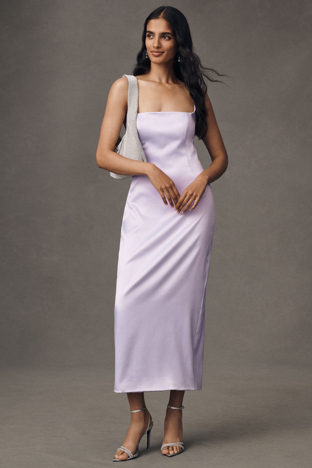 One chic column, this midi dress is rendered in stretch satin for a glossy shine that keeps you comfortable. It hugs the figure from the square neckline to the ankle-grazing hem.